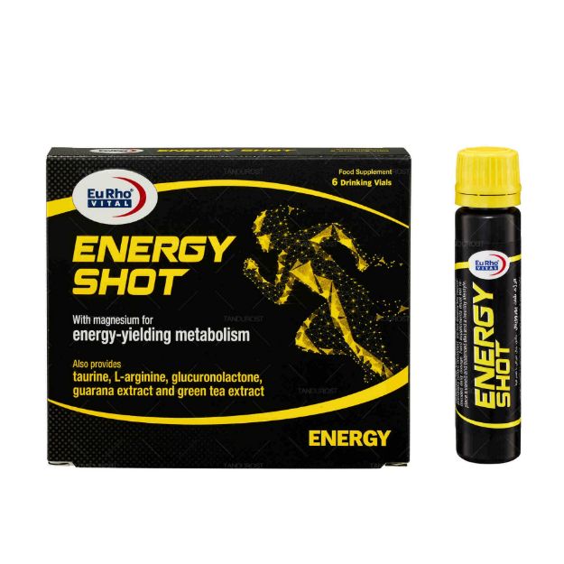 نرژی شات یورو ویتال آلمان که تحت لیسانس این شرکت در داخل کشور بسته بندی می گردد، یکی از بهترین مکمل های ورزشی جهت افزایش تمرکز تمرینی،افزایش کیفیت تمرین و افزایش توان ورزشکاران می باشد. یکی از نکات برتر این مکمل انرژی زا فرم فیزیکی آن است که به دلیل مایع بودن از کیفیت ساخت بسیار بالایی برخوردار بوده و از انواع قرصی و پودری آن سریع جذب تر بوده و به سرعت اثرات خود را در بدن ورزشکار نشان می دهد. انرژی شات یورو ویتال با داشتن منیزیم(کمک به رفع گرفتگی های عضلانی)، تائورین(رفع خستگی و ریکاوری)،گلوکورونولاکتون( افزایش سوخت و ساز و افزایش تمرکز)،آرژنین( افزایش خون رسانی به بافت های بدن وافزایش تمرکز کمک به رشد عضلات)،گوارانا( افزایش تمرکز تمرینی و کمک به ریکاوری)و سیترولین(افزایش قدرت و انرژی ورفع خستگی)مجموعه کاملی از عوامل انرژی زا و افزایش متابولیسم را درکنار هم جمع آوری کرده است. انرژی شات یورو ویتال آلمان به صورت شات های مایع خوراکی به حجم 25 میلی لیتر بوده که هر بسته بندی این مکمل ورزشی حاوی 6 عدد شات خوراکی می باشد. هر شات مایع خوراکی 25 میلی لیتری این مکمل ورزشی شامل: 160 میلی گرم منیزیم، 1 گرم آرژنین، 80 میلی گرم گوارانا، 100 میلی گرم گلوکورونولاکتون، 100 میلی گرم تائورین،100 میلی گرم سیترولین و 10 میلی گرم عصاره چای سبز می باشد.